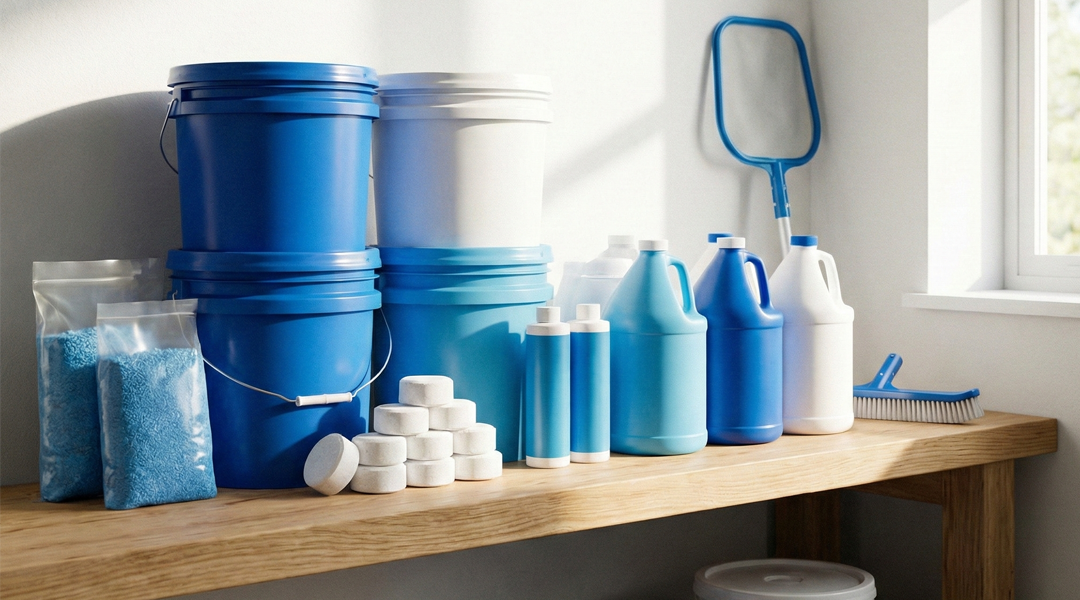 Produtos químicos essenciais para tratamento e manutenção de piscinas, garantindo água limpa, segura e cristalina.